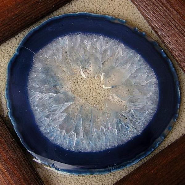 Piękny agat brazylijski ułożony na barwionym piasku kwarcowym i zanurzony w żywicy syntetycznej.