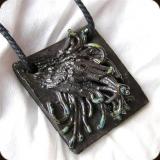 Muszla Cyprea tigris ułożona na barwionym piasku kwarcowym i pokryta żywicą syntetyczną.
