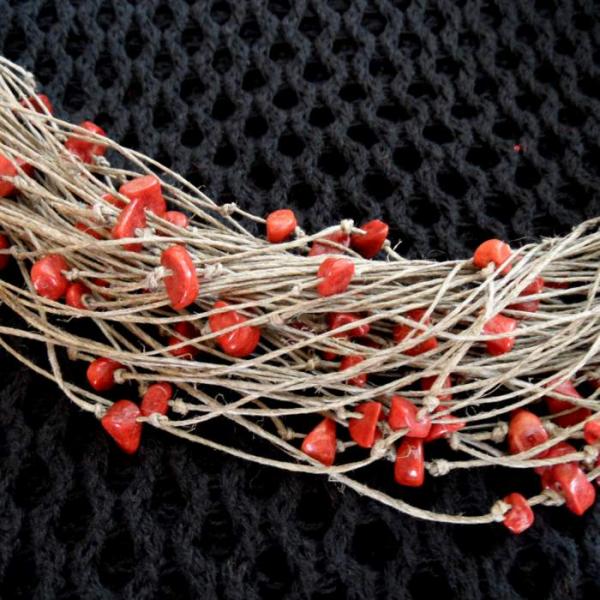 Bogaty naszyjnik z koralowca i mnóstwa nitek dratwy lnianej, .