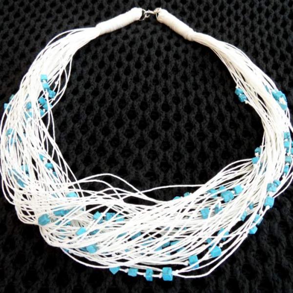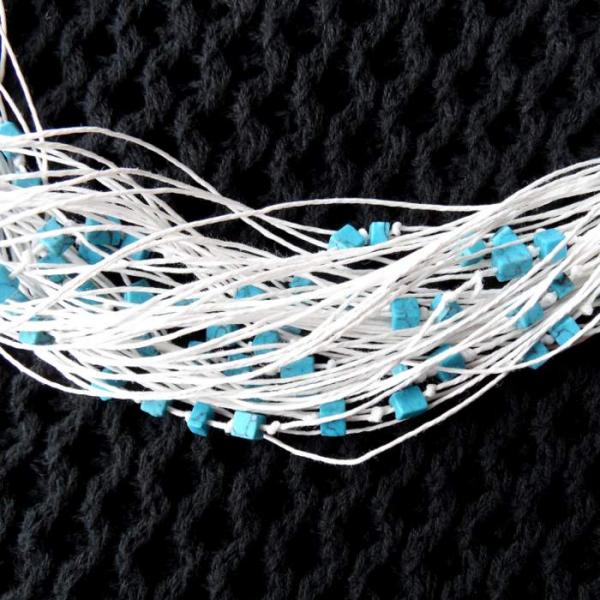Bogaty naszyjnik z kostek turkusowego howlitu i mnóstwa nitek bielutkiej dratwy lnianej, zapinany na karabińczyk, z regulacją długości - łańcuszek 5 cm dł.