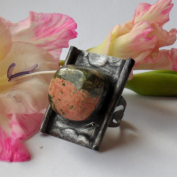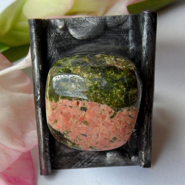 Pierścień z zielonym jaspisem czyli unakitem, w obróbce typu Tiffany, patynowany na stare srebro, szlifowany.