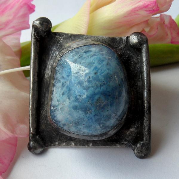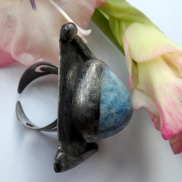 Pierścień z błękitnym agatem w obróbce typu Tiffany, patynowany na stare srebro, szlifowany.